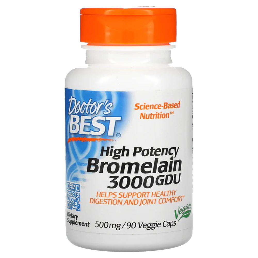 Η βρωμελίνη είναι ένα ένζυμο που προέρχεται από το στέλεχος και τα φρούτα του ανανά που έχει πρωτεολυτικές (πρωτεϊνο-πεπτικές) ιδιότητες. Η βρωμελίνη που βρίσκεται στο Doctor's Best 3000 GDU Η βρομελίνη είναι μια από τις πιο ισχυρές μορφές αυτού του ενζύμου που βρίσκεται στην αγορά. Το 3000 GDU αναφέρεται στην τυποποίηση της ενζυματικής ισχύος και αντανακλά την ποιότητα της πρώτης ύλης που χρησιμοποιείται στο προϊόν. Η βρωμελίνη είναι γνωστή για τα χαρακτηριστικά της που ενισχύουν την πέψη και έχει επίσης ευεργετικές συστηματικές επιδράσεις στο σώμα. Η βρωμελίνη μπορεί επίσης να βοηθήσει στην υποστήριξη της καρδιαγγειακής υγείας και της υγείας των αρθρώσεων.