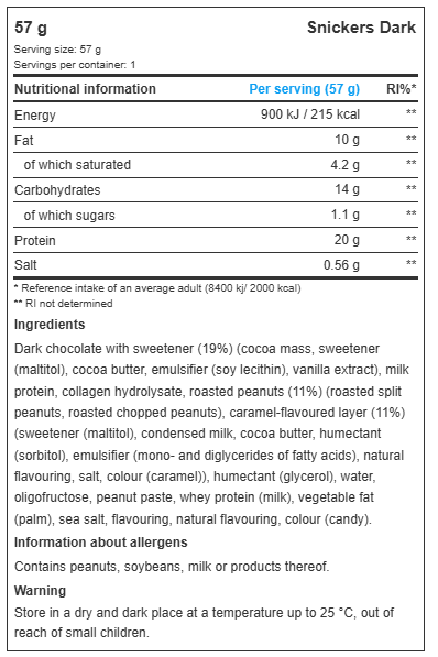 Αντικαθιστώντας το τυπικό γάλα με μια παρακμιακή επικάλυψη μαύρης σοκολάτας, αυτή η μπάρα πρωτεΐνης Snickers επαναλαμβάνει 20 γραμμάρια πρωτεΐνης και μόλις 1 γραμμάριο σάκχαρα συνολικά.