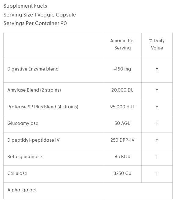 - Η άλφα-γαλακτοσιδάση βοηθά στη διάσπαση των σύνθετων σακχάρων τα οποία βρίσκονται στα λαχανικά και τα όσπρια, προλαμβάνοντας το φούσκωμα και τα αέρια. Η κυτταρινάση βοηθά στην απελευθέρωση θρεπτικών συστατικών από τις φυτικές ίνες.