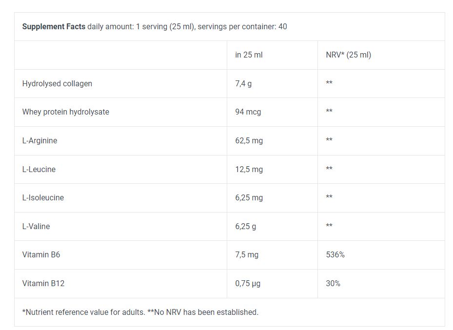 Water, hydrolysed collagen 29.5%, invert sugar, maltodextrin, acid (citric acid), whey protein hydrolysate 0.38%, L-Arginine 0.25%, flavouring, preservatives (sorbic acid, sodium benzoate), L-Leucine 0.05%, L-Valine 0.025%, L-Isoleucine 0.025%, sweeteners (acesulfame K, sucralose), pyridoxine hydrochloride, cyanocobalamin.
